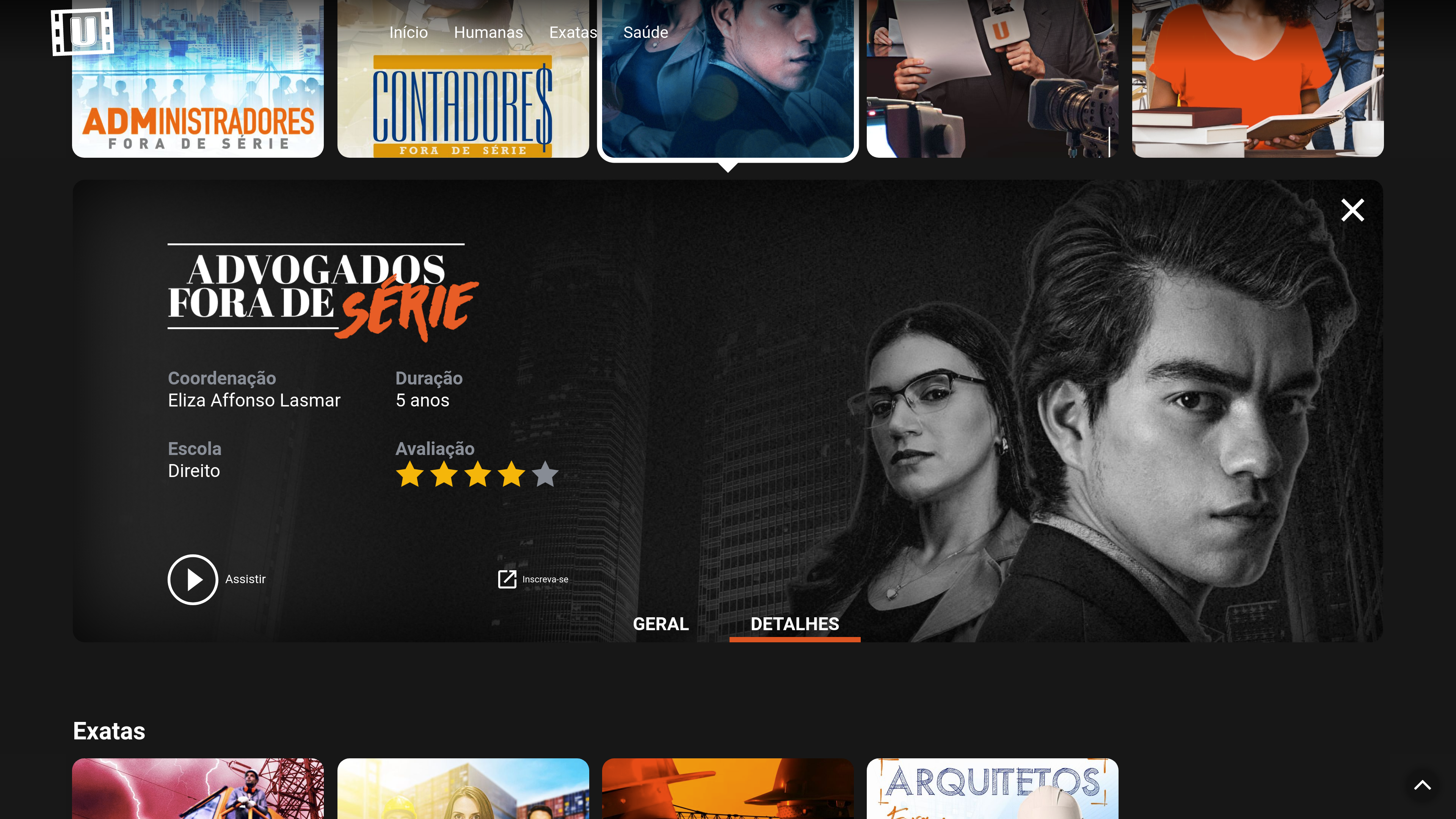 Os três primeiros episódios já estão disponíveis, sendo eles: Direito, Enfermagem e Engenharia. Os cursos possuem uma sinopse no site que faz referência a ementa curricular, já as notas do MEC estão representadas pelas estrelas de classificação.