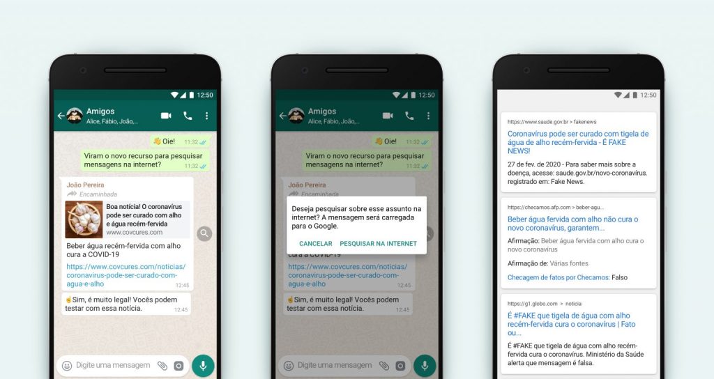 Em mais uma medida de combate a disseminação de fake news, o WhatsApp agora permite que os usuários verifiquem a veracidade de mensagens encaminhadas. O novo recurso funciona de forma simples: ao receber uma mensagem encaminhada por algum contato, o usuário verá um botão de lupa. Ao clicar no botão, abrirá a opção de pesquisa no Google para verificar as informações da mensagem repassada.