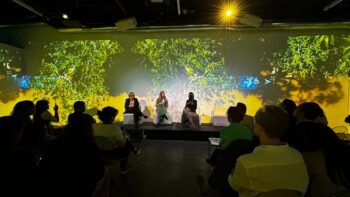 Participantes: Isabelle Nogueira (cunhã poranga do boi Garantido), Monique Galvão (Rare), Daniel Contrucci (Climate Ventures).
