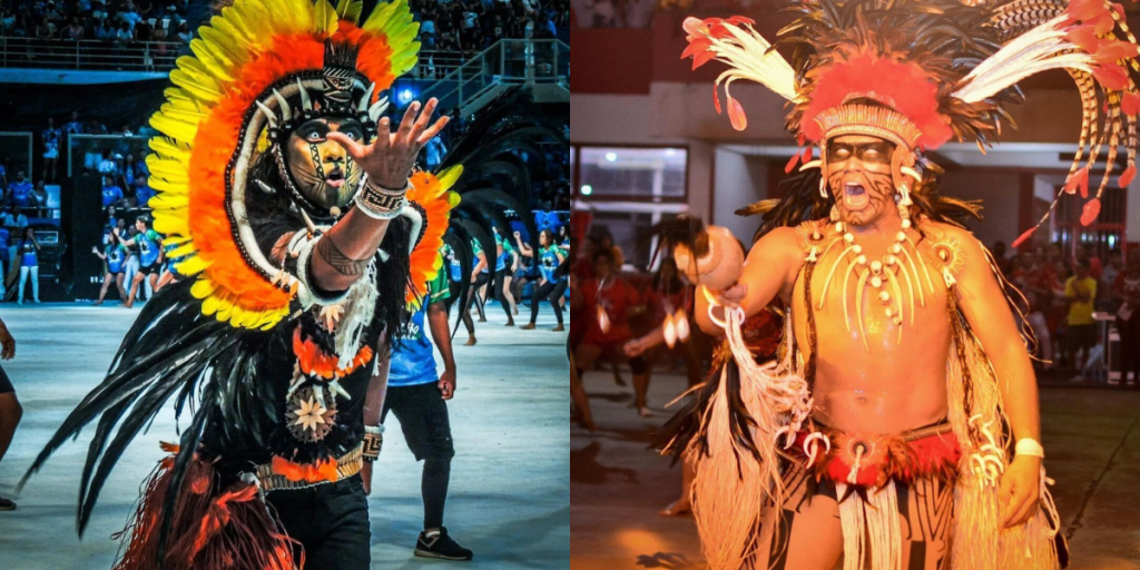 Elementos comparativos: Indumentária, fidelidade ao tema do espetáculo e riqueza dos detalhes nas confecções do capacete (cocar alegórico).