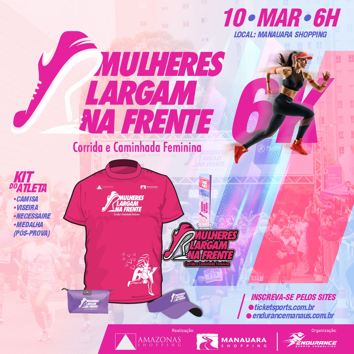 Estão abertas as inscrições para a primeira edição da Corrida e Caminhada “Mulheres Largam na Frente”, em Manaus, evento que será realizado no dia 10 de março, a partir das 5h45, em referência ao Dia Internacional da Mulher. A iniciativa é fruto de parceria entre o Manauara Shopping e o Amazonas Shopping, e promete marcar o calendário esportivo, celebrando a representatividade feminina.